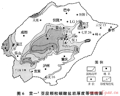 綜上所述,上述2套儲(chǔ)層的發(fā)育條件和區(qū)域分布不同,風(fēng)化殼型巖溶儲(chǔ)層受微相和巖溶作用的控制,縱向上分布在風(fēng)化殼下數(shù)十米范圍內(nèi),平面上分布于有利巖相和有利巖溶古地貌單元疊合部位,初步預(yù)測(cè)LG-營山-西充-遂寧是勘探有利區(qū),勘探面積約2×104km2;顆粒白云巖儲(chǔ)層主要受微相控制,雷一顆粒灘分布于川中磨溪-廣安地區(qū),面積約1×104km2;雷三顆粒灘分布于龍門山前帶,面積約8000km2。
