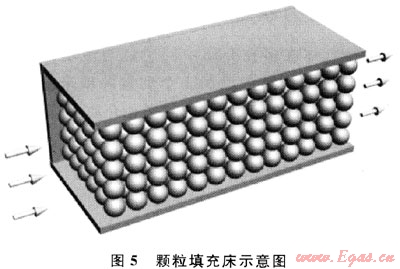 氣流在多孔介質(zhì)中的流動阻力主要是由流體質(zhì)點間存在相互牽制作用、流體與多孔介質(zhì)的表面摩擦造成的。圖5為顆粒填充床示意圖。對于氣流在顆粒填充床與泡沫陶瓷中的流動,若兩者的比表面積及空隙率相等,可認為兩者的流動阻力是近似相等的。
