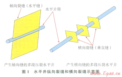 通常水平井分段壓裂裂縫存在2種極限情況:縱向和橫向(1)。當(dāng)水平井井筒方位與最大水平主應(yīng)力方位垂直時(shí),可產(chǎn)生橫向裂縫;當(dāng)兩者方位一致時(shí),可產(chǎn)生軸向裂縫(縱向裂縫);當(dāng)兩者夾角處于其他情況時(shí),裂縫形態(tài)會(huì)非常復(fù)雜。由于水平井軸向裂縫有效泄流面積相對(duì)橫向裂縫來(lái)說(shuō)小很多,一般希望水平井壓裂產(chǎn)生橫向裂縫作為裂縫網(wǎng)絡(luò)的主裂縫。頁(yè)巖氣井最佳的壓裂效果是產(chǎn)生垂直于水平井段的橫向主裂縫的同時(shí),產(chǎn)生垂直于橫向裂縫的二級(jí)裂縫,以提高裂縫與地層的接觸面積,有利于頁(yè)巖氣的解吸附和氣體在儲(chǔ)層中的流動(dòng)。據(jù)統(tǒng)計(jì),水平井分段壓裂的裂縫以橫向裂縫為主[3-5]