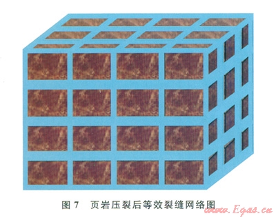 頁巖氣有效開發(fā)的前提就是頁巖儲(chǔ)層的大規(guī)模壓裂(體積壓裂),目的是形成復(fù)雜的裂縫網(wǎng)絡(luò),大大改善頁巖儲(chǔ)層的滲流能力。假設(shè)圖7所示的裂縫網(wǎng)絡(luò)等效整體壓裂后頁巖儲(chǔ)層的實(shí)際裂縫網(wǎng)絡(luò),壓裂裂縫寬度為w(m),小頁巖塊的長(zhǎng)、寬、高均為a(m),則每個(gè)小頁巖塊的表面積為S6a2(m2),每個(gè)頁巖塊所控制的裂縫體積約為V3a2w.忽略井筒中殘留的壓裂液,則每個(gè)小頁巖塊吸水百分比為: