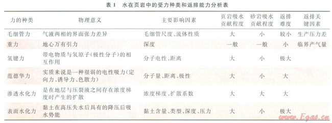 1總結(jié)了水在頁巖中的受力種類及其返排情況。能返排出去的水主要為受毛細(xì)管壓力和重力影響的那部分水,與致密砂巖相比,頁巖的孔隙更小、黏土礦物更多,因此壓裂液返排率普遍都低于致密砂巖氣井。由氫鍵力、范德華力、滲透水化力以及表面水化力作用控制的那部分水很難返排,因此這部分水含量的多少直接決定了頁巖最終返排率的大小。