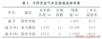 目前頁巖氣藏通常采用低砂比體積壓裂,裂縫寬度相對(duì)更小,因此頁巖氣藏返排時(shí)間長(zhǎng),返排率低是客觀必然。表2是某頁巖氣藏氣井的壓裂液返排數(shù)據(jù),可以看到商井的返排率最高,水平井水平段越長(zhǎng),壓裂規(guī)模越大,返排率越低。這與上面認(rèn)識(shí)一致,即壓力規(guī)模小,壓裂液更集中在井底附近的大尺度網(wǎng)絡(luò)縫隙中,返排率相對(duì)較高;壓裂規(guī)模入,壓裂液更多地分散在小尺度縫網(wǎng)中,返排率更低。