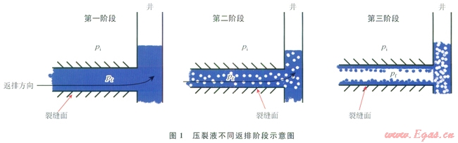 壓裂液在進(jìn)入貞巖之后,其返排過程大致可以分為以下3個(gè)階段(1):第一階段,水力壓裂裂縫中壓裂液的壓力(pf)大于原始地層壓力(pi)時(shí),由于壓裂液與巖石的綜合壓縮能,壓裂液會(huì)少量攜帶游離氣返排出來,此時(shí)反排難度最??;第二階段,當(dāng)pf<pi時(shí),此時(shí)處于生產(chǎn)初期,裂縫中為氣液兩相流動(dòng),氣體會(huì)驅(qū)替液體返排,此過程反排難度較?。坏谌A段,當(dāng)pf<pi時(shí),此時(shí)處于生產(chǎn)中后期,裂縫中自由水已經(jīng)被大量返排,而殘留在裂縫表面的水需要?dú)怏w大于臨界攜液流速才能帶走。