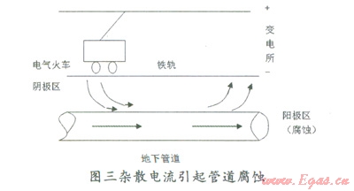 2)雜散電流。所謂雜散電流是指沿規(guī)定回流以外流動(dòng)的電流。雜散電流流出的地方成為腐蝕電池的陽(yáng)極區(qū),腐蝕破壞就發(fā)生在這個(gè)地方,金屬損失量與流過的雜散電流的電量成正比,符合法拉第定律,即一安培電流流過一年就相當(dāng)于約九公斤的鐵發(fā)生電化學(xué)腐蝕而溶解掉了,可見雜散電流引起的腐蝕是相當(dāng)嚴(yán)重的。