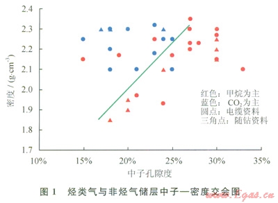 根據(jù)上述分析,采用交會(huì)圖技術(shù)研究了兩者在測(cè)井響應(yīng)上的差別。在樂東l5-1/22-1研究區(qū)選取了經(jīng)測(cè)試、電纜測(cè)試取樣或試生產(chǎn)證實(shí)含量相對(duì)比較高的甲烷或二氧化碳層段(表1),并定義甲烷含量高于50%的氣層為以甲烷為主的氣層,否則為以非烴為主(CO2為主)的氣層,然后利用這些層段的測(cè)井資料分別作出了密度一中子、密度一聲波交會(huì)圖(圖1、2)。從圖l、2中可以看出:烴類氣與二氧化碳?xì)怏w在測(cè)井響應(yīng)值上是存在一定差別的,從而可以通過這種差異來區(qū)分烴類氣與二氧化碳?xì)鈱?sup>[10]。