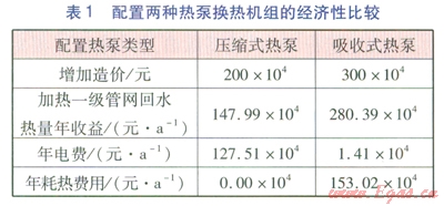 配置兩種熱泵換熱機組的經(jīng)濟性比較見表l,熱價按57.92元/GJ計算,電價按0.854(kW·h)計算。由表1可計算得,配置壓縮式熱泵的換熱機組年凈收益為20.48×104元/a,增加造價200×104元,投資回收期約l0a。配置吸收式熱泵的換熱機組年凈收益為l25.96×104元/a,增加造價300×104元,投資回收期約3a