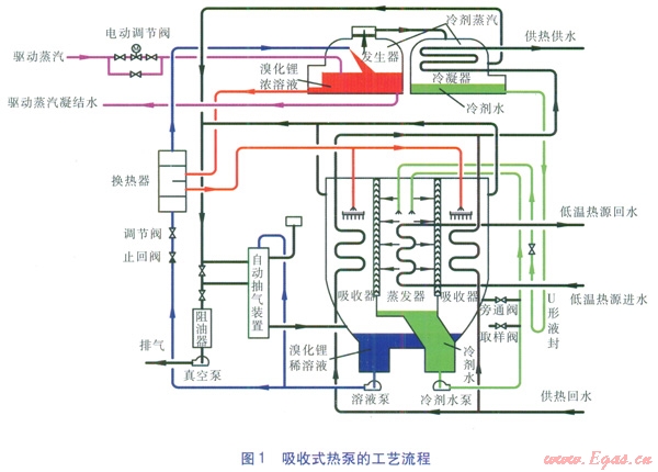 供熱回水在流經(jīng)吸收器管簇時吸收了低壓冷劑蒸汽攜帶的熱量,從而保證了吸收過程的不斷進行,同時供熱回水的溫度得到提升,并在流經(jīng)冷凝器管簇時被冷劑蒸汽進一步加熱,達到設(shè)計要求溫度。低溫熱源進水在蒸發(fā)器管簇內(nèi)流過時,熱量被管外的冷劑水閃蒸時帶走,溫度降低。由此可見,供熱介質(zhì)不但吸收了驅(qū)動蒸汽的熱量,而且通過熱泵利用了低溫熱源的部分熱量,這也是吸收式熱泵供熱節(jié)能的主要原因之一。吸收式熱泵使用介質(zhì)為溴化鋰水溶液,屬于無污染物質(zhì),但系統(tǒng)較為復雜,占空間大。