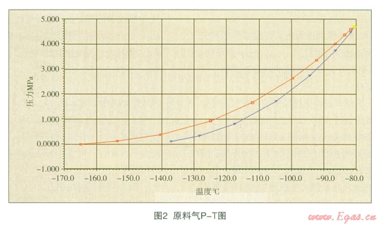 在特定壓力下,利用根據(jù)圖l建立的系統(tǒng)模型對(duì)煤層氣從初溫-40℃冷卻至-l40℃的過(guò)程中對(duì)煤層氣的T-H進(jìn)行模擬計(jì)算,結(jié)果詳見(jiàn)表2。