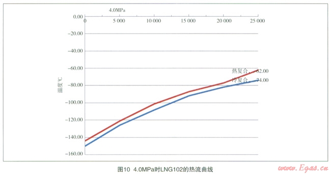 由圖4可以看出當(dāng)系統(tǒng)壓力高于臨界壓力時(shí),煤層氣的等壓冷凝過(guò)程不再經(jīng)過(guò)兩相區(qū),而且等壓溫度曲線(xiàn)隨著壓力的升高愈加平滑;當(dāng)系統(tǒng)壓力低于臨界壓力時(shí)煤層氣的等壓冷凝過(guò)程需經(jīng)過(guò)兩相區(qū),而且壓力越低在汽液兩相區(qū)停留的區(qū)間就會(huì)越大。煤層氣壓力越高,越有利于冷箱中冷熱物流熱交換平衡和物流間的平均溫差。