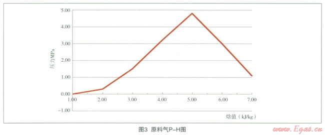 利用流程模擬圖可以原料氣P-T-H(P:壓力、T:溫度、H:焓值)的相關(guān)數(shù)據(jù),具體數(shù)據(jù)及曲線(xiàn)圖見(jiàn)表1、圖2、圖3。