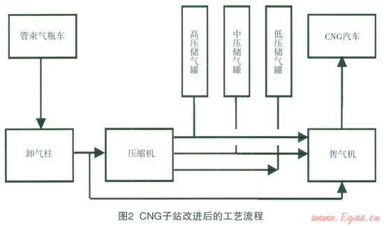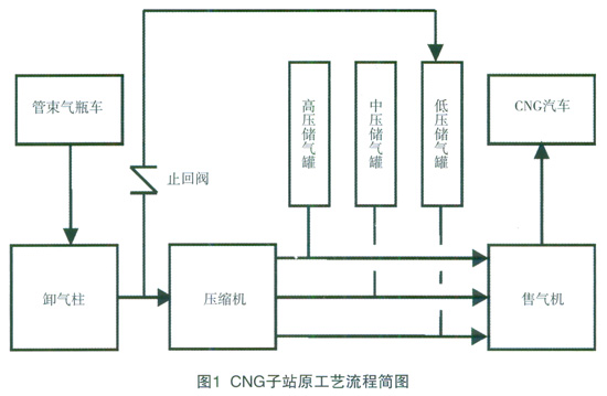 管束氣瓶中天然氣經(jīng)卸氣柱后分為二路流動(dòng):一路連接到壓縮機(jī)進(jìn)氣管,當(dāng)中壓儲(chǔ)氣罐低于設(shè)定值時(shí),壓縮機(jī)進(jìn)入工作狀態(tài)(原流程);第二路在壓縮機(jī)進(jìn)氣口前增設(shè)一管線(xiàn)直接單獨(dú)進(jìn)入加氣機(jī)低壓加氣系統(tǒng)。在任何時(shí)候管束氣瓶中天然氣都直接進(jìn)入加氣機(jī)低壓系統(tǒng),加氣機(jī)低壓氣不再經(jīng)過(guò)壓縮機(jī)。從管束氣瓶接入子站開(kāi)始運(yùn)行至卸氣結(jié)束時(shí)間,一直利用管束氣瓶中天然氣自身壓力通過(guò)低壓電磁閥向CNG汽車(chē)加氣,當(dāng)CNG汽車(chē)鋼瓶壓力達(dá)到設(shè)定壓力或流量小于設(shè)定值時(shí),通過(guò)電磁閥自動(dòng)轉(zhuǎn)換,再取中、高壓罐中天然氣向CNG汽車(chē)充氣,直到CNG汽車(chē)鋼瓶中天然氣壓力達(dá)到20MPa時(shí),單車(chē)加氣完成。