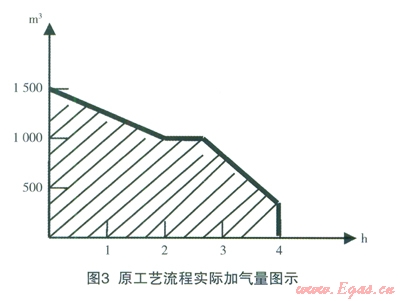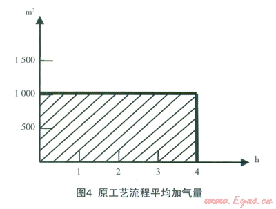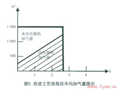 改進(jìn)工藝流程平均加氣量圖示:上部為管束氣瓶直接加入CNG汽車(chē)天然氣氣量,下部為經(jīng)壓縮機(jī)壓縮的加氣量;改進(jìn)工藝流程后加氣量由1000m3h增加到1500m3h;一輛管束車(chē)卸氣時(shí)間由原4h/車(chē)縮短到3h/車(chē)以?xún)?nèi);改進(jìn)工藝流程后相對(duì)減少了壓縮機(jī)開(kāi)機(jī)時(shí)間,減少了壓縮機(jī)的磨損并降低了能耗,實(shí)現(xiàn)了壓縮機(jī)在原有排氣量不變情況下提高加氣量的目的。
