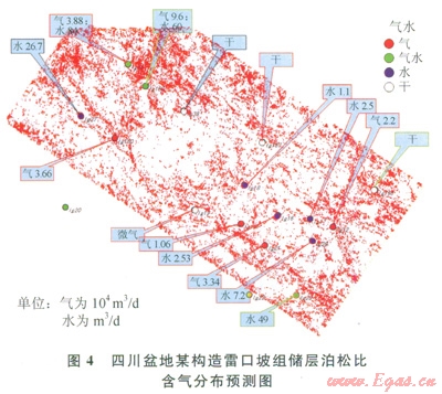 預(yù)測得到的含氣分布如圖4所示,紅色為含氣。該區(qū)4口純產(chǎn)氣井,3口井位于或緊鄰低泊松比部位(紅色)1口井位于不含氣部位,5口純產(chǎn)水井均位于不含氣的部位,3口氣水同產(chǎn)井都位于或靠近含氣部位,4口干井有2口井位于不含氣部位??傮w看,l6口井3口井不符合(符合率為81)。