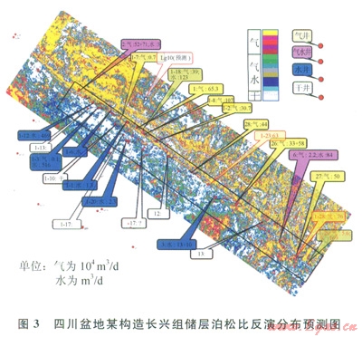 反演得到預(yù)測區(qū)域目的層泊松比均值分布圖(3),紅、黃色代表含氣,綠、藍(lán)色代表含水,灰、白色代表非儲(chǔ)層。圖3中指示框的顏色為含流體類別(氣、氣水、水),其中的數(shù)據(jù)為產(chǎn)量。可以看到,預(yù)測的氣水分布與試油結(jié)果基本對應(yīng),效果較明顯,26口井有21口符合,符合率81%。