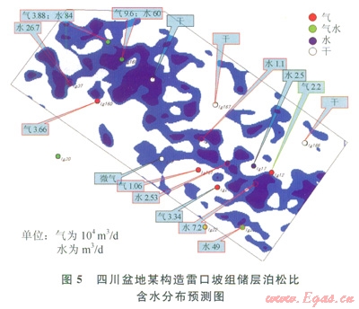 5為預(yù)測的含水分布預(yù)測圖。圖5中,5口純產(chǎn)氣井和3口氣水同產(chǎn)井有7口位于預(yù)測的含氣分布區(qū),有l口井不符合,4口純產(chǎn)氣井均不在預(yù)測的含水部位,4口干井有2口處于預(yù)測的含水部位。16口井有3口井不符合(符合率為81)