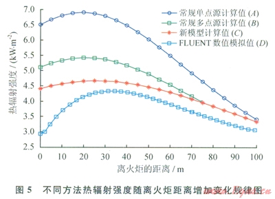 2)將新提出的改進(jìn)模型計(jì)算結(jié)果分別與數(shù)值模擬結(jié)果、設(shè)計(jì)規(guī)范使用的常規(guī)單點(diǎn)源模型計(jì)算結(jié)果以及常規(guī)多點(diǎn)源模型計(jì)算結(jié)果進(jìn)行對比,驗(yàn)證了新模型計(jì)算出的熱輻射強(qiáng)度有著更高的精度。因此,基于分區(qū)域—多點(diǎn)源模型實(shí)現(xiàn)了在計(jì)算高架火炬射流火焰熱輻射時(shí)的快速簡便計(jì)算且精度較高,可以克服現(xiàn)有規(guī)范標(biāo)準(zhǔn)中對熱輻射強(qiáng)度估計(jì)過高,安全距離劃分過于保守的不足,為石化企業(yè)高架火炬安全距離的合理劃定、現(xiàn)有高架火炬安全距離設(shè)計(jì)規(guī)范的優(yōu)化與改進(jìn)提供參考。