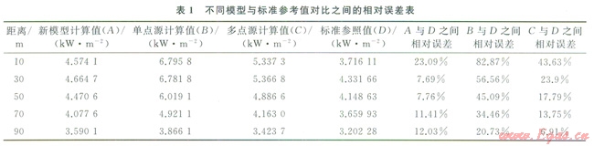 從圖5可以看出,4個(gè)計(jì)算結(jié)果值呈現(xiàn)出一樣的變化規(guī)律,在下風(fēng)向距離,隨著與火炬距離的增加,熱輻射強(qiáng)度呈現(xiàn)先增加后減少的趨勢。在不同距離取四者數(shù)值進(jìn)行對比,如表l所示,新模型計(jì)算結(jié)果與標(biāo)準(zhǔn)參考值之間的相對誤差除了在10m處為23.09%,其余在30m、50m、70m、90m處均低于l5%;常規(guī)單點(diǎn)源模型計(jì)算結(jié)果與標(biāo)準(zhǔn)參考值之間的相對誤差在不同距離處的波動(dòng)較大,在10m處,相對誤差較火(大于80%),隨著距離的變大,相對誤差有減小的趨勢,但在各點(diǎn)始終均大于新模型與標(biāo)準(zhǔn)參考值之間的相對誤差;而與新模型取相同點(diǎn)源數(shù)的常規(guī)多點(diǎn)源計(jì)算結(jié)果與標(biāo)準(zhǔn)參考值之間的相對誤差相比較于單點(diǎn)源計(jì)算值減小了許多,但在70m范圍內(nèi)相對誤差仍遠(yuǎn)大于新模型計(jì)算值,在70m范圍之外,常規(guī)多點(diǎn)源與標(biāo)準(zhǔn)參考值之間的相對誤差才達(dá)到可接受的l5%之內(nèi)。總體來說,相比于與常規(guī)單點(diǎn)源和常規(guī)多點(diǎn)源計(jì)算結(jié)果,以數(shù)值模擬的結(jié)果為標(biāo)準(zhǔn)參照,新模型計(jì)算出的熱輻射強(qiáng)度有著更高的精度,同時(shí)計(jì)算復(fù)雜程度沒有提高很多,滿足工程使用的要求,可以在確定高架火炬安全距離得到很好的應(yīng)用與推廣。