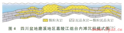 以四川盆地下三疊統(tǒng)嘉陵江組為例,顆粒灘在臺地內(nèi)部十分發(fā)育,其分布主要受臺內(nèi)原始古地貌和海平面變化控制[32]。盆地內(nèi)不同地區(qū)臺內(nèi)灘發(fā)育特征有差異,但總體上具有以下特點:顆粒含量高,以砂屑和鮞粒為主;交錯層理普遍發(fā)育;垂向上形成向上變淺的沉積序列;海侵期顆粒灘發(fā)育時間短,規(guī)模相對較小,灘體厚度多為l~3m;高位域顆粒灘規(guī)模較大,厚度介于1~8m。