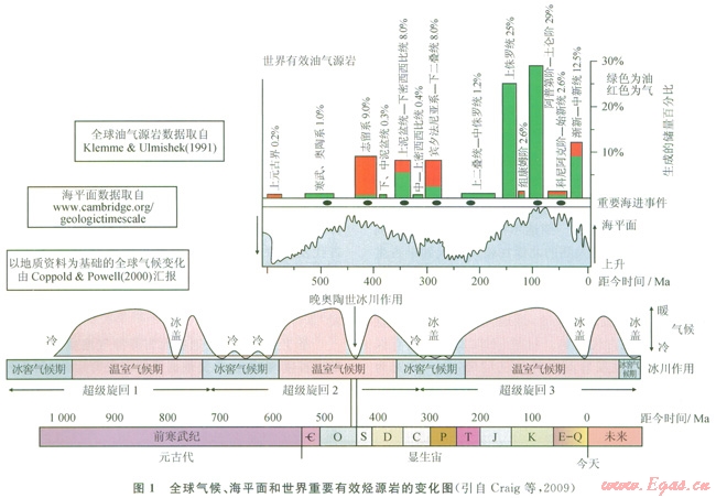 從烴源巖分布的角度考慮,不同時(shí)代全球氣候、海平而和源巖分布之間存在較好的對(duì)應(yīng)關(guān)系。Craig等人[1]研究距今l000Ma以來(lái)全球氣候變化、海平面和世界主要有效油氣源巖時(shí)代分布的對(duì)應(yīng)關(guān)系(圖1),指出高海平面期對(duì)應(yīng)于溫室氣候期,冰川融化導(dǎo)致海平面上升,有利于富有機(jī)質(zhì)沉積物堆積,是世界許多重要油氣源巖沉積的主要時(shí)期。如北非,志留系底部發(fā)育后冰川期烴源巖,直接覆蓋在上奧陶統(tǒng)儲(chǔ)層系之上,古生界含油氣系統(tǒng)的總儲(chǔ)量約為500×108桶油當(dāng)量[2]。