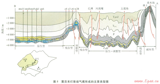 新近紀(jì)以來(lái)的喜馬拉雅運(yùn)動(dòng),對(duì)盆地深層震旦系產(chǎn)生4種變形方式:①強(qiáng)烈的褶皺沖斷作用變形,主要發(fā)生在盆地周緣,導(dǎo)致震旦系出露地表,如盆地東南緣的桑木場(chǎng)構(gòu)造;②強(qiáng)烈褶皺、隆升,但震旦系未遭受剝蝕,如威遠(yuǎn)地區(qū)隆升幅度較高(3000~4000m)[30];③中淺層變形強(qiáng)烈,但震旦系未卷入變形或變形微弱,如川東、蜀南地區(qū);④深層及中淺層均未卷入變形或變形微弱,如磨溪—高石梯地區(qū)。除第一變形方式對(duì)震旦系氣藏起破壞作用之外,其余的變形對(duì)震旦系氣藏調(diào)整有影響,但未被破壞?;诖耍蓪⑾采狡谡鸬┫禋獠乜煞譃檎{(diào)整型(如威遠(yuǎn)氣田)、殘存型(如資陽(yáng)地區(qū))、原生型(如磨溪 高石梯氣田)、原生—調(diào)整型(如蜀南深層)(圖5)。按此評(píng)價(jià)有利勘探區(qū)帶,磨溪—高石梯廣安一帶長(zhǎng)期處于古今構(gòu)造疊合的高部位,是最有利勘探區(qū);有利區(qū)為遂寧—南充斜坡帶,較有利區(qū)為川東—蜀南深層。