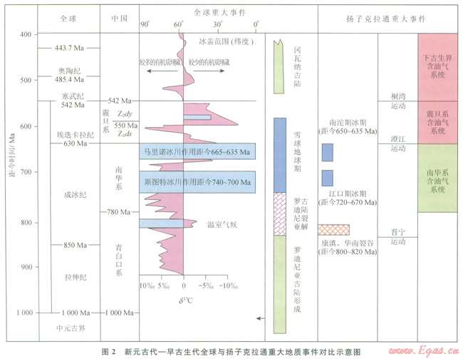新元古代到早寒武世時(shí)期,全球發(fā)生了一系列重大地質(zhì)事件[13-18]:①羅迪(Rodinia)超級(jí)古陸的形成、穩(wěn)定和初始破裂,發(fā)生在距今大約750Ma前的拉伸紀(jì)至早成冰世;②全球性冰川作用,發(fā)生在中成冰世至早埃迭卡拉世階段(距今750~600Ma),包括兩次重大冰川作用,斯圖特冰川作用和馬里諾冰川作用;③岡瓦納超級(jí)古陸的形成和穩(wěn)定,發(fā)生在中埃迭卡拉世至早寒武世階段(距今約600Ma以后)。
