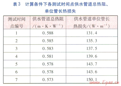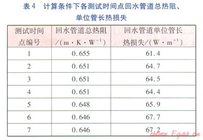 計算條件(指保溫層、保護(hù)層材料熱導(dǎo)率均取計算值時)下各測試時間點供回水管道總熱阻、單位管長熱損失分別見表3、4