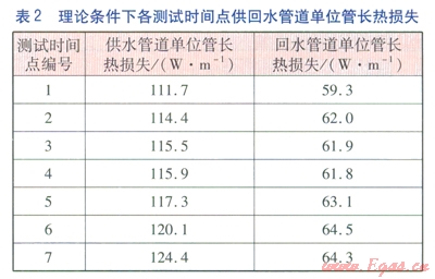 由已知數(shù)據(jù)可計算得附加熱阻為0.043m·KW,將Ri+RPE+Rsoi定義為總熱阻。當(dāng)保溫層材料熱導(dǎo)率取理論值(0.0275W·m-1·K-1),保護(hù)層材料熱導(dǎo)率取理論值(0.041W·m-1·K-1)時,總熱阻計算結(jié)果為0.693m·Kw。理論條件(指保溫層、保護(hù)層材料熱導(dǎo)率均取理論值時)下各測試時間點供回水管道單位管長熱損失見表2