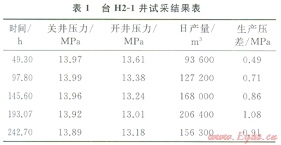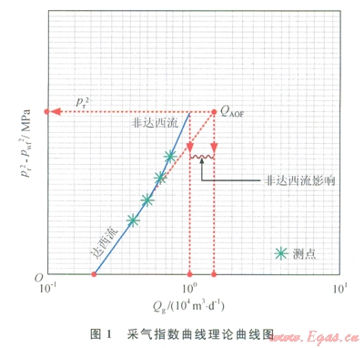 接著用采氣指數(shù)法對該井進(jìn)行滲流動態(tài)描述[3]。該方法主要根據(jù)滲流力學(xué)原理,將氣體滲流控制在達(dá)西流的范圍內(nèi),以達(dá)到保護(hù)儲層、避免出砂的目的。根據(jù)臺H2-1井的試采數(shù)據(jù),其臨界點(diǎn)在生產(chǎn)壓差lMPa(即地層壓力的7%左右),在此生產(chǎn)壓差下其日產(chǎn)量為16×104m3,也即理論上的最高配產(chǎn)量(1)