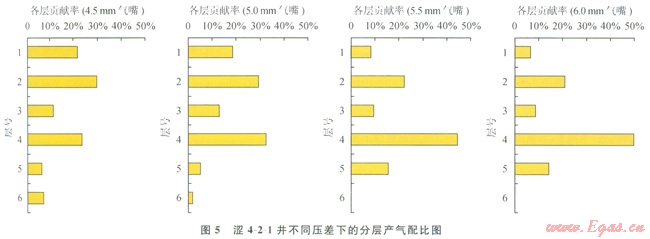 該技術(shù)需要首先進(jìn)行地質(zhì)研究,根據(jù)地層系數(shù),得到各層理論產(chǎn)出配比情況。研究結(jié)果認(rèn)為:4、5號層為該井的主力氣層。然后根據(jù)不同工作制度序列,進(jìn)行產(chǎn)氣剖面測試,獲得不同壓差下的分層相對產(chǎn)氣配比情況(5)。