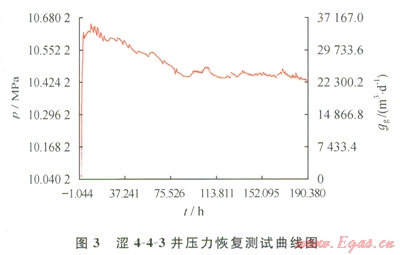 如澀4-4-3井,20086月關(guān)井測壓力恢復(fù)曲線(3)。關(guān)井期間,套管處于開井生產(chǎn)狀態(tài),從壓力曲線上看,關(guān)井初期壓功處于上升趨勢,從關(guān)井l.5h后開始壓力處于上下波動中,但整體上處于下降趨勢,判斷油套密封性不嚴(yán)。
