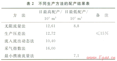 氣井的最小攜液產(chǎn)量也是配產(chǎn)的重要考慮參數(shù)。該參數(shù)用以保證氣井生產(chǎn)時(shí)井筒不產(chǎn)生積液。臺H2-1井分別采用73mm、60.3mm、48.3mm3種規(guī)格的油管進(jìn)行模擬計(jì)算,得出其最小臨界攜液日產(chǎn)量分別為7.1×104m3、4.9×104m33.2×104m3。目前該井使用的為73mm油管,確定其最小臨界攜液流量為7.1×104m3d。通過以上幾種方法配產(chǎn)方法,其匯總結(jié)果如表2所示。