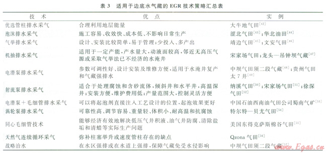 我國邊底水氣藏大多數(shù)已進入開發(fā)中后期階段,面臨水侵現(xiàn)象嚴重,而采取人工排水采氣技術更應注意各種排水工藝的技術特點以及適應條件,以便取得最好的排水效果。通過多年的研究和發(fā)展,目前國內外都已形成了各自的提高邊底水氣藏采收率的技術。其針對邊底水氣藏的EGR技術策略總結如表3所示。
