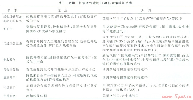 針對低滲透氣藏的增產(chǎn)措施已貫穿于從地質研究、鉆井、完井、氣藏工程等直到氣藏停產(chǎn)的整個過程,其主要作用是增大氣體在儲層段的滲透能力,以增加單井產(chǎn)量、最終采收率,最終提高經(jīng)濟效益。低滲透氣藏的EGR技術策略總結如表l所示。