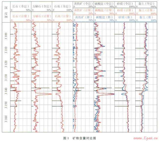 碳組分碳酸鹽則由鈣組分的測(cè)量中精準(zhǔn)地獲得,石膏鹽則由Ca和S的測(cè)量來確定,地層中的剩余組分則為QFM(石英+長石+云母)[7-8]。從圖1中可以看出,筆者計(jì)算得到的砂質(zhì)與斯倫貝謝計(jì)算的砂質(zhì)吻合的非常好,變化趨勢(shì)基本一致;黏土和碳酸鹽吻合較好,整體變化趨勢(shì)一致;而黃鐵礦吻合效果較差,但筆者計(jì)算的結(jié)果與全巖分析的吻合效果優(yōu)于斯倫貝謝與全巖分析的吻合結(jié)果。