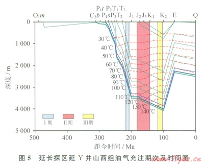 山西組砂巖中流體包裹體的測溫結果表明:①延長地區(qū)上古生界山西組至少存在3期流體活動,第Ⅰ期流體活動的主峰溫度在85~90℃,規(guī)模較??;第Ⅱ期流體活動的主峰溫度在115~120℃,這期流體形成了大量石英加大邊;第Ⅲ期流體活動的主峰溫度在135~155℃,流體規(guī)模較大。②高于l65℃的樣品點34個,溫度范圍較分散。③從測點數(shù)日來看,110~165℃區(qū)間內的數(shù)據(jù)點較多,共計482個。在3期流體活動中均檢測到含烴包裹體,因此推測其與油氣充注有關。將流體包裹體的均一溫度投影在單井埋藏史圖上(圖5),發(fā)現(xiàn)3期油氣充注分別發(fā)生在晚三疊世、中晚侏羅世和早白堊世。