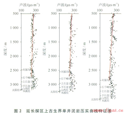 該區(qū)上古生界發(fā)育2套區(qū)域性蓋層:①下二疊統(tǒng)太原組海相石灰?guī)r,厚度介于15~45m,分布穩(wěn)定,也是本溪組的直接蓋層;②上石盒子組與石干峰組發(fā)育的泥質巖系,厚度介于l50~350m,分布穩(wěn)定,橫向連續(xù),是山西組~下石盒子組氣藏的重要蓋層。對該區(qū)上古生界泥巖的壓實研究表明,聲波時差明顯高于正常壓實趨勢(圖2),表明上古生界普遍存在古超壓現(xiàn)象[11-13],其過剩壓力介于5~20MPa,最大過剩壓力出現(xiàn)在上石盒子組—石千峰組,組成上古生界壓力封存箱的箱頂,天然氣很難突破箱頂超壓體而在箱內成藏[14-15]。前人的研究也表明[16-19],鄂爾多斯盆地上古生界匕石盒子組與石干峰組泥巖封蓋性能優(yōu)越,具有物性封閉和壓力封閉雙重封閉特征。