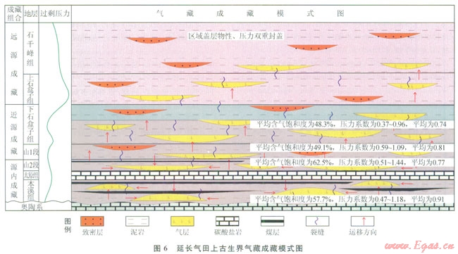 壓力封存箱的結構差異[17]、烴源巖與儲層的空間配置關系控制著氣藏天然氣的富集程度。山2段及本溪組暗色泥巖與煤系地層是主力生烴層系,本溪組與山2段屬于源內成藏,以初次運移直接充注為主,充注程度高,表現(xiàn)為含氣飽和度高,分別為57.7%和62.5%;而山l段和盒8段位于主力烴源巖上部,為近源成藏,以二次運移垂向充注為主,表現(xiàn)為含氣飽和度相對較低,分別為49.1%和48.3%;上石盒子組和石千峰組離主力烴源巖更遠,屬于遠源成藏,受生烴強度的限制及本身具有物性和壓力雙重封蓋,天然氣很難運移至層內成藏,只有在局部封閉性能較差且生烴強度較高、氣源交充足的地方才可能形成工業(yè)氣藏。