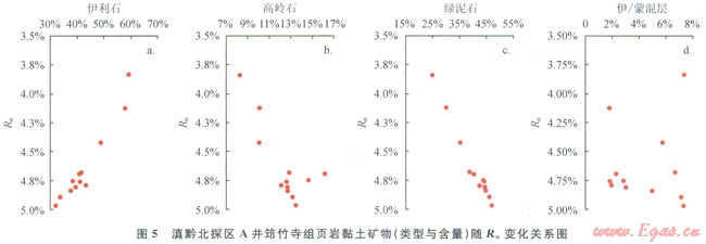 研究區(qū)筇竹寺組頁(yè)巖熱演化程度較高,R。均大于3.0%。根據(jù)巖心不同黏土礦物含量隨R。的變化關(guān)系圖(圖5)可以看出,隨R。的增大,具有較大比表面積的伊利石含量增大、伊/蒙混層含量減少,具有較小比表面積的綠泥石含量增大、高嶺石含量增大。而上覆的龍馬溪組頁(yè)巖熱演化程度相對(duì)低些(R。多小于3.0%),與筇竹寺組頁(yè)巖黏土礦物相比,其伊利石含量高(13%~36%)、伊/蒙混層含量比較少(2%~6%)、綠泥石含量高(13%~32%)、高嶺石含量高(6%~9%)。因而出現(xiàn)了筇竹寺組黏土礦物間微孔隙的比表面積和孔體積遠(yuǎn)比龍馬溪組小的情形,導(dǎo)致其比表面積和孔體積均較小的狀況(表2)。因此,熱演化程度通過(guò)對(duì)黏土礦物類型與含量的影響,也同樣控制著黏土礦物間微孔隙的發(fā)育程度。由此得出,已處于過(guò)成熟中期后的滇黔北筇竹寺組頁(yè)巖層,經(jīng)歷悠久的地質(zhì)作用過(guò)程和過(guò)高熱演化程度嚴(yán)重制約了其微觀孔隙結(jié)構(gòu)特征,呈現(xiàn)微孔隙驟減和比表面積、孔體積明顯較小的情形,不利于頁(yè)巖氣的吸附儲(chǔ)集,結(jié)果出現(xiàn)筇竹寺組頁(yè)巖氣富集程度不如龍馬溪組的狀況。