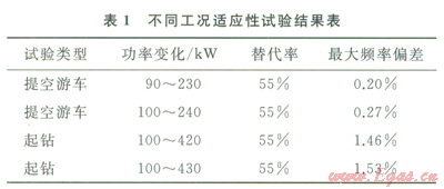 3)提空游車適用性試驗結(jié)果分析。試驗井深4000m,單機(jī)功率從l00kW突加至230kW,發(fā)電機(jī)組在雙燃料模式下頻率波動0.2%,相對于柴油模式0.2%的頻率波動,無影響。起鉆試驗單機(jī)功率從l00kW突加至430kW,發(fā)電機(jī)組在雙燃料模式下頻率波動1.53%,相對于柴油模式1.2%的頻率波動有所增加,但不影響鉆井工作,試驗結(jié)果如表1所示。