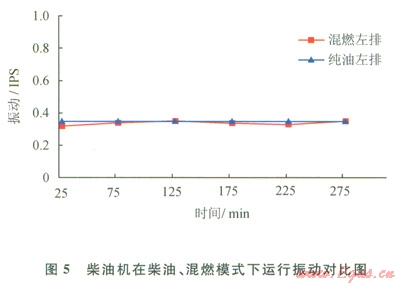 2)排溫和振動試驗分析。試驗功率為450kw,柴油機(jī)在柴油、混燃模式下運(yùn)行300min(替代率33.81),排溫和振動[8-10]試驗結(jié)果相差不大(4、5)。