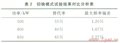 4)切換模式對比分析。分別在500kW、600kW650kW 3種工況下,進(jìn)行天然氣切斷時的響應(yīng)測試,最大頻率偏差2.27%,小于國家標(biāo)準(zhǔn)5%。分別在500kW(替代率55)、600kW(替代率60)650kW(替代率65)工況下,GTI機(jī)組頻率增加均沒有超過l%。試驗結(jié)果表2所示。