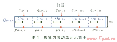 假設(shè)流體經(jīng)過裂縫面進入裂縫后向水平井筒的流動為一維線性流動(1)。為了便于計算,將微元段處理成矩形進行汁算,裂縫寬度為wfk+1,以計算流體在裂縫中流動時產(chǎn)生的壓力降落。