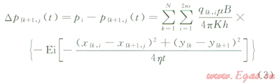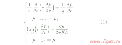 式中r為徑向距離,m;p為地層壓力,MPa;h為導(dǎo)壓系數(shù),m2·MPa/(mPa·s)hK/(mcj);m為流體黏度,mPa·s;c為地層綜合壓縮系數(shù),MPa-1;t為生產(chǎn)時間,ks;pi為原始地層壓力,MPaq為井產(chǎn)量,m3ks;h為儲層厚度,mK為巖石滲透率,Dj為孔隙度。
