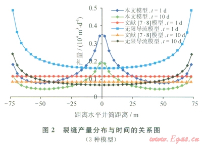 23種模型第l條裂縫的產(chǎn)量分布對比結(jié)果。采用無限導(dǎo)流模型計算結(jié)果表明,由于沒有考慮裂縫內(nèi)的壓力降落,在生產(chǎn)初期(tld)裂縫內(nèi)的產(chǎn)量分布為“U”形,裂縫兩端產(chǎn)量相對較高,這與本文參考文獻[15]規(guī)律一致;本文模型考慮了裂縫產(chǎn)量非均勻分布以及裂縫內(nèi)的壓力損失,裂縫產(chǎn)量在水平井筒附近出現(xiàn)局部峰值,且隨裂縫內(nèi)壓力損失增大,井筒附近裂縫產(chǎn)量的峰值越明顯,這是由于越靠近井簡裂縫生產(chǎn)壓差越大,裂縫產(chǎn)量越高造成的;由于裂縫段內(nèi)相互干擾,隨著生產(chǎn)時間的增加,裂縫產(chǎn)量分布趨于均勻,但由于水平井筒壓力最低,裂縫上產(chǎn)量分布為近似“雙U”型,這與本文參考文獻[l4]規(guī)律相符合。