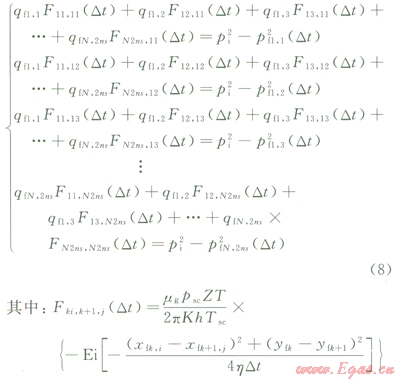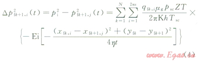上面就完成了第一個Dt時間步長下各線匯單元及總產(chǎn)量計算;對于各線匯單元而言,由于產(chǎn)量會隨生產(chǎn)時間發(fā)生變化,這樣就需要利用時間疊加來求得任意時刻的值。設(shè)時間段步長為Dt,當(dāng)時tmDt(m個時間段的結(jié)尾),則對第k+1條裂縫的第j個線匯,可得到: