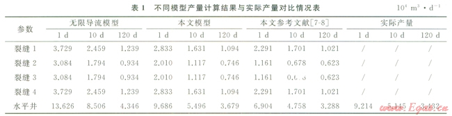分別按照裂縫無限導(dǎo)流模型、本文模型以及本文參考文獻[7-8]的計算結(jié)果與實際產(chǎn)量對比(1)??梢钥闯?,本文模型的計算結(jié)果從初期到穩(wěn)定生產(chǎn)階段最接近,表明本文模型準(zhǔn)確性高。從3種模型計算結(jié)果的對比來看:無限導(dǎo)流模型計算生產(chǎn)ld時的產(chǎn)量為13.626×104m3d、生產(chǎn)120d后產(chǎn)量為4.346×104m3a,遠高于實際產(chǎn)量,表明不能忽略裂縫內(nèi)壓力損失的影響。從本文參考文獻[7-8]模型的計算結(jié)果與實際產(chǎn)量對比可以看出,生產(chǎn)初期差別較大(分別為6.904×104m3a9.214×104m3d),而在生產(chǎn)120d的差別變小,這表明采用均勻產(chǎn)量分布的假設(shè)與實際情況存在較大偏差。