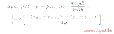 平面直角坐標(biāo)系下,設(shè)在裂縫k上有一線匯M(x2fk,iykf)(產(chǎn)量為qfk,i),在裂縫k+1上有一觀察點位于O(xfk+,j,yfk+1),線匯qfk,i連續(xù)生產(chǎn)時間t后在O點產(chǎn)生的壓力降落為: