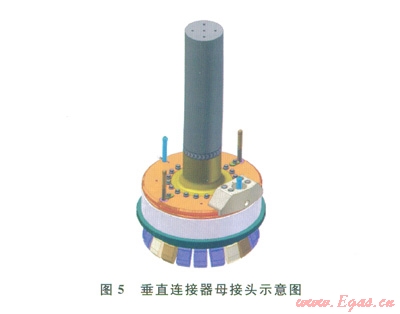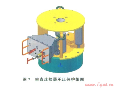垂直連接器的公接頭一般安裝在管匯/采油樹上,母接頭裝在跨接管上、安裝時(shí)與公接頭對接(圖4、5)。水下連接器保護(hù)帽分為不承壓和承壓兩種形式(圖6、7)。不承壓保護(hù)帽對水下連接器的公接頭起到保護(hù)作用,也可隨著接頭安裝到水下,一般建議在水下的停留時(shí)間不超過42d。承壓保護(hù)帽可用于長期的公接頭保護(hù)(期限與公接頭使用壽命相同),根據(jù)密封形式的不同,也可用做隔斷使用,即橡膠密封的承壓保護(hù)帽可用作二級隔斷使用,金屬密封的承壓保護(hù)帽可用作一級隔斷使用。