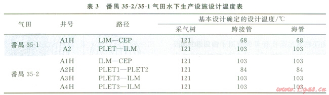 在基本設(shè)計(jì)過程中,對番禺35-2/35-1水下生產(chǎn)設(shè)施設(shè)計(jì)溫度確認(rèn)(表3)。在詳細(xì)設(shè)計(jì)中,溫度的調(diào)整會(huì)導(dǎo)致水下設(shè)備(包括各類球閥和閘閥、水下連接器、水下管匯和水下采氣樹)及水下管線(生產(chǎn)管線和跨接管)設(shè)計(jì)的調(diào)整,不但影響項(xiàng)目后期的進(jìn)度和費(fèi)用,也會(huì)限制生產(chǎn)井的產(chǎn)能,從而不能按照預(yù)定配產(chǎn)進(jìn)行生產(chǎn)。