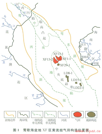 鶯歌海盆地位于我國海南島與越南之間海域,呈北西向展布,面積約為ll.3×104km2,為典型的欠壓實(shí)型高溫高壓新生代含油氣盆地。XF區(qū)位于鶯歌海盆地中北部底辟帶上,繼20世紀(jì)90年代發(fā)現(xiàn)XFl-1淺層氣田(上新統(tǒng)鶯歌海組二段)后,近期中深層(22中新統(tǒng)黃流組)勘探中又相繼發(fā)現(xiàn)了XFl3-1、XFl3-2大型巖性+構(gòu)造復(fù)合型氣田。儲(chǔ)層砂巖體類型在平面上分異明顯,不同類型砂巖體厚度變化大;儲(chǔ)層非均質(zhì)性明顯,中孔、高滲至低孔、特低滲儲(chǔ)層均有出現(xiàn),反映了XF區(qū)物源方向的差異性。